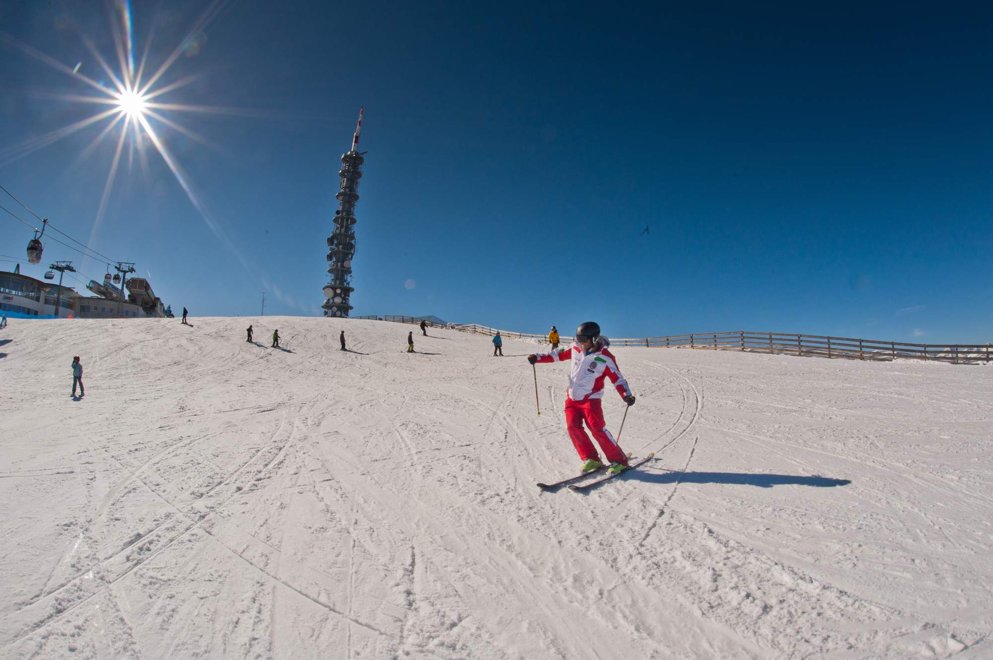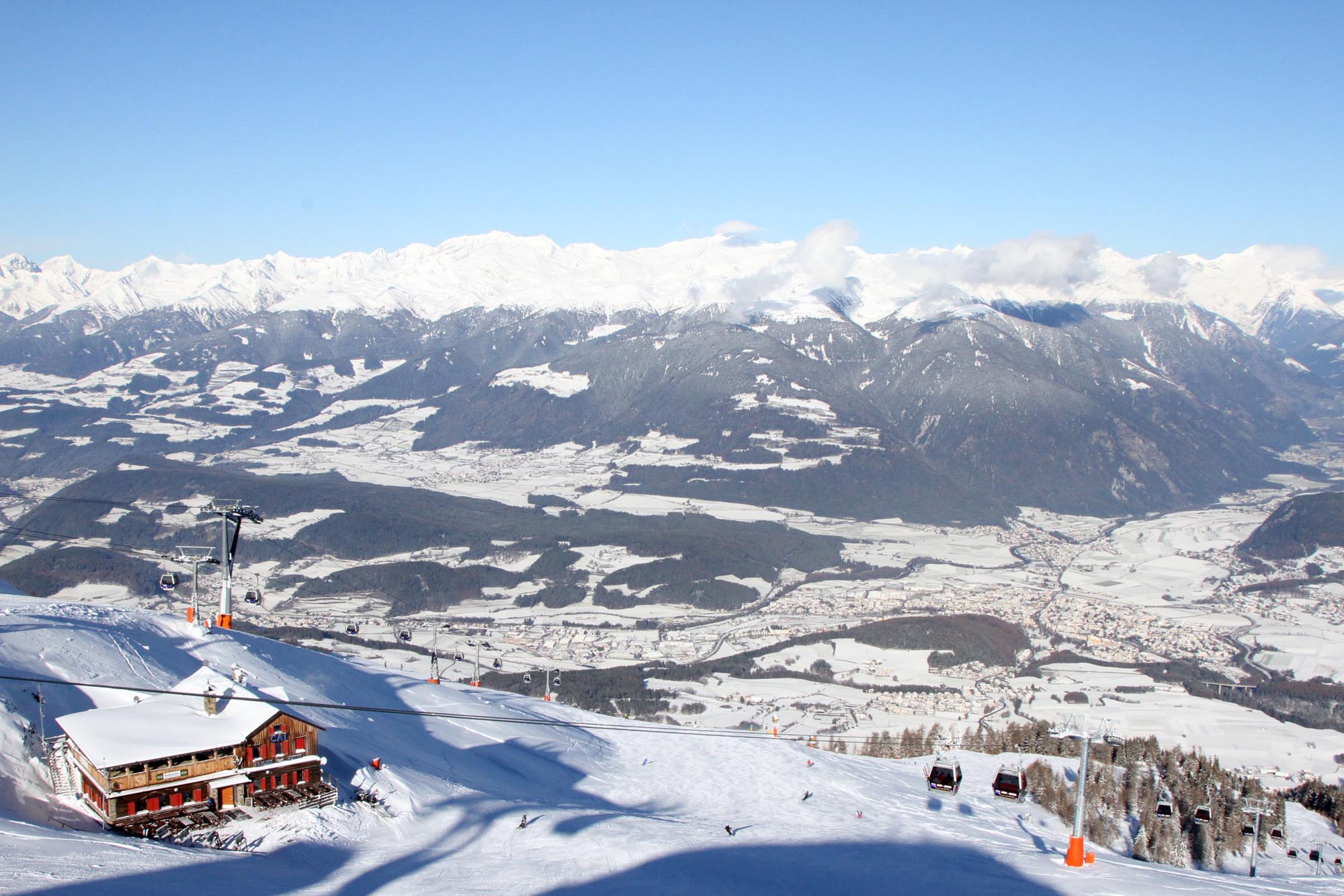 High above the Pustertal - Pusteria Valley, with wide open look over the whole valley, over to the bizzare Dolomites in the south to the brusque Zillertaler alps in the north. The Kronplatz 2.273 m high - a situation, marvellously and with an incomparable view. 360° panorama. 31 rise plants in total, 17 powerful cable railways and 14 chair lifts may guarantee for great fun on the slopes without trouble. Finally you come for skiing and not for queue up.